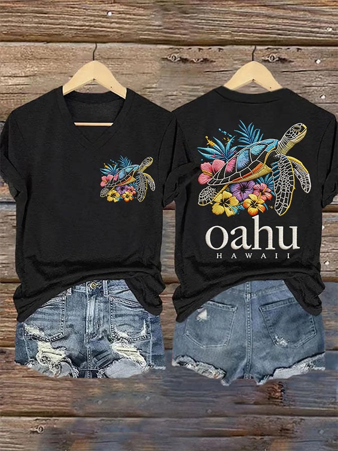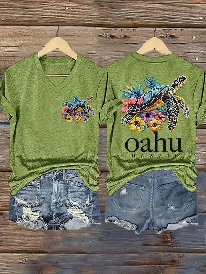 Women's Casual Oahu Hawaii Sea Turtle Oahu Strong Printed Short-Sleeve T-Shirt